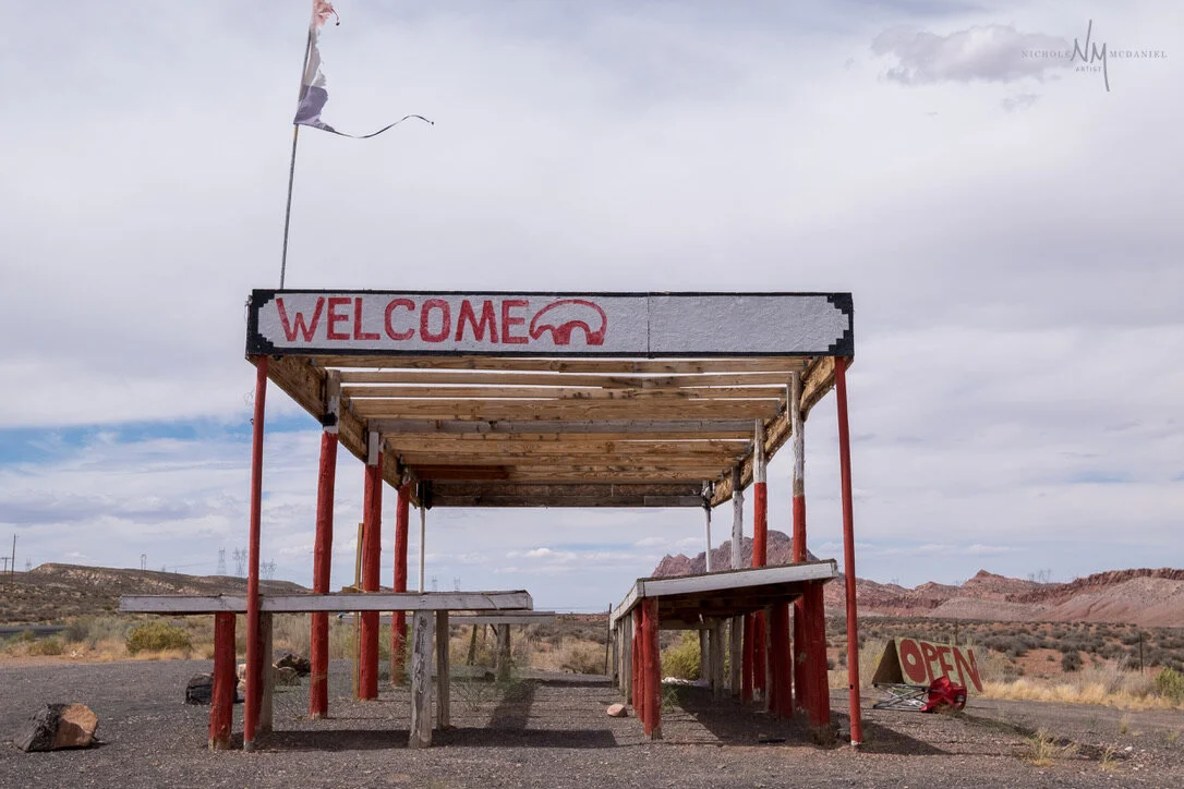 Heading north on the 89, we came across an abandoned and vandalized gas station and a motel. The gas station had vibrant murals that caught my eye from the side of the road. Ben and I decided to pull over and jumped out to take some photos. The color of the buildings, art, and desert background provided great material for my photos. The Native American imagery was beautiful and told a story.